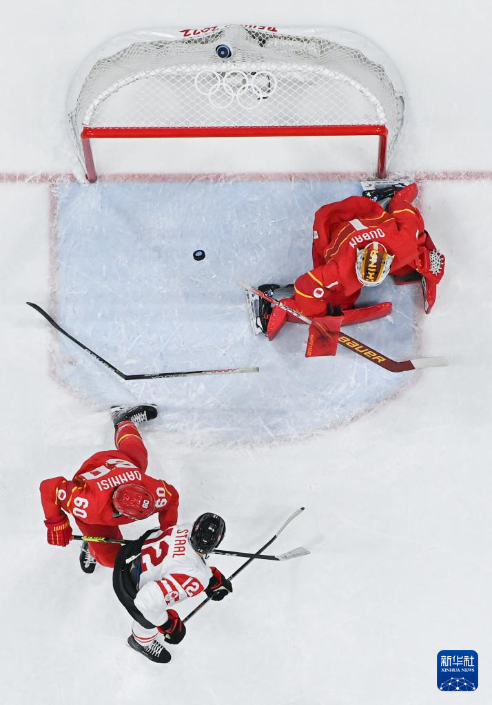 Goalkeeper Yongli Ouban (1st L) makes a save during the ice hockey men's preliminary round Group A match between China and Canada at National Indoor Stadium in Beijing, capital of China, Feb. 13, 2022. (Xinhua/Liu Xiao)