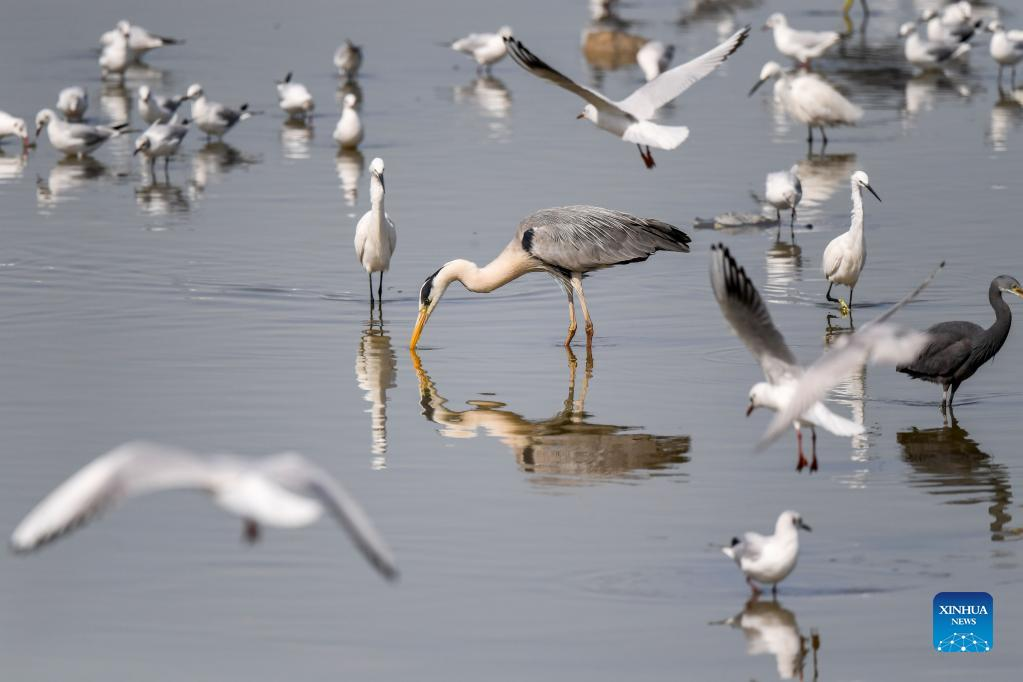 Birds forage at a beach in Jahra Governorate, Kuwait, Feb. 12, 2022. (Photo by Ghazy Qaffaf/Xinhua)