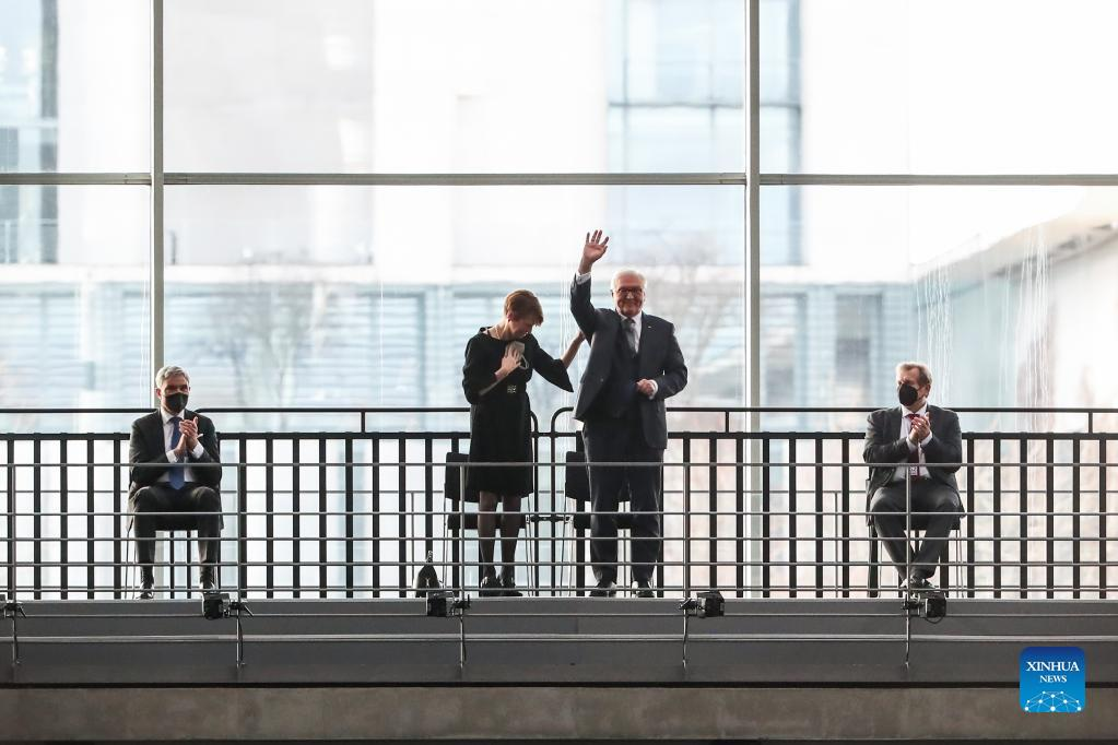 Frank-Walter Steinmeier (2nd R) waves his hand after his re-election as president of the Federal Republic of Germany during the 17th Federal Convention in Berlin, capital of Germany, Feb. 13, 2022. Steinmeier was re-elected as German president on Sunday. (Xinhua/Shan Yuqi)