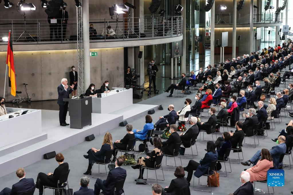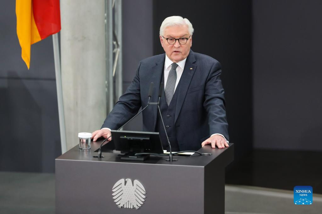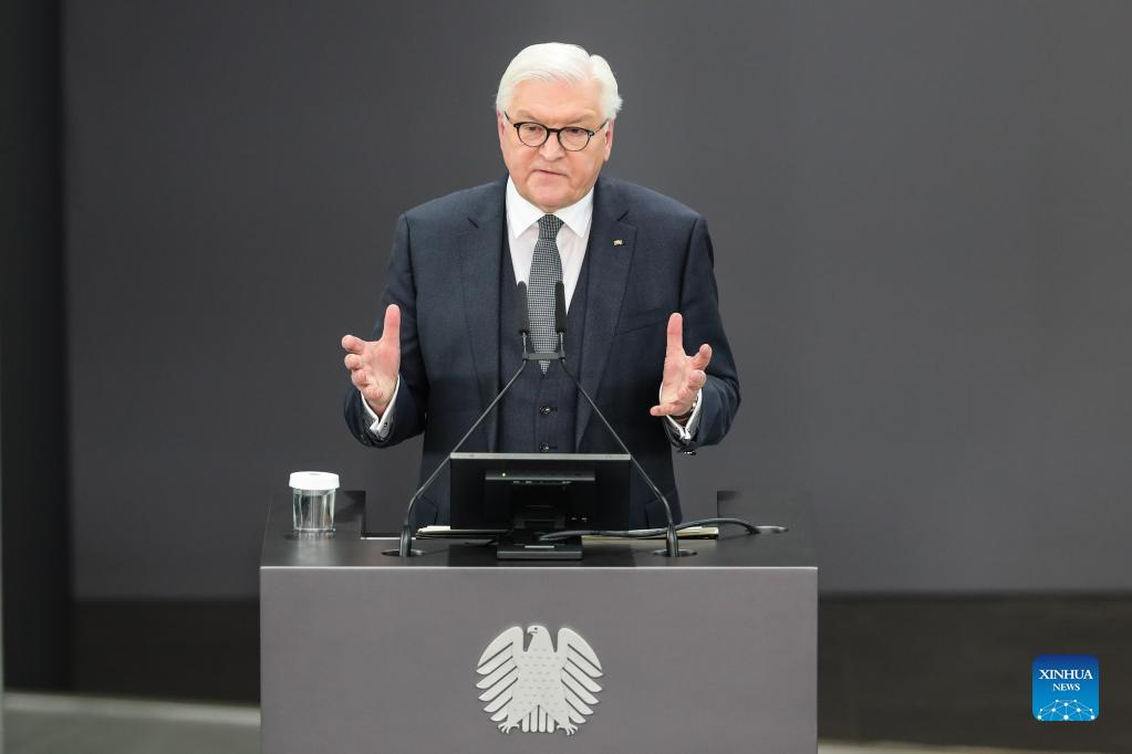 Frank-Walter Steinmeier delivers a speech after his re-election as president of the Federal Republic of Germany during the 17th Federal Convention in Berlin, capital of Germany, Feb. 13, 2022. Steinmeier was re-elected as German president on Sunday. (Xinhua/Shan Yuqi)