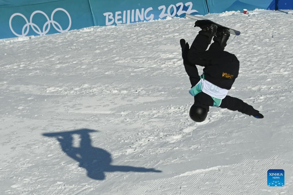 Rong Ge of China competes during women's snowboard big air qualification of Beijing 2022 Winter Olympics at Big Air Shougang in Beijing, capital of China, Feb. 14, 2021. (Xinhua/Huang Zongzhi)