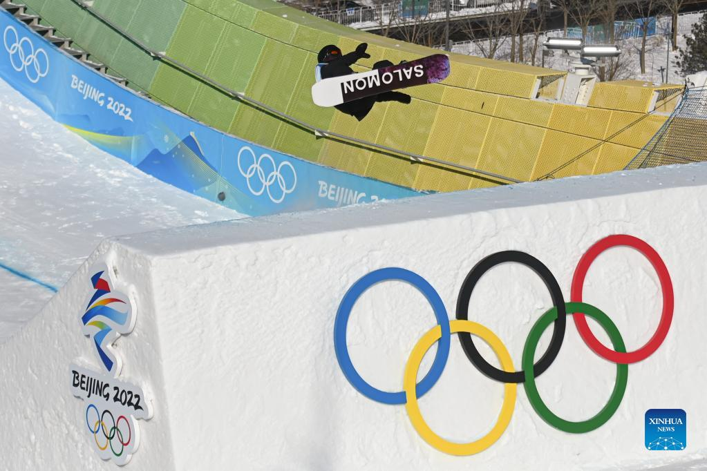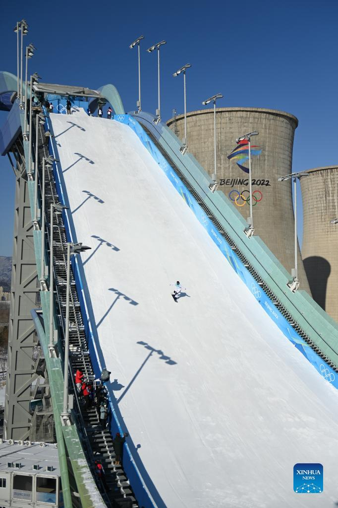 Lucile Lefevre of France competes during the women's snowboard big air qualification of Beijing 2022 Winter Olympics at Big Air Shougang in Beijing, capital of China, Feb. 14, 2021. (Xinhua/Huang Zongzhi)