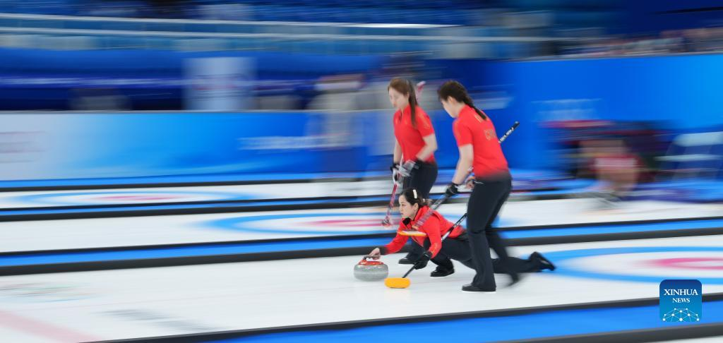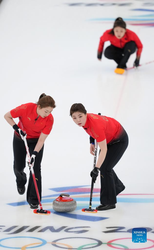 Wang Rui (C) of China competes during the curling women's round robin session 7 of Beijing Winter Olympics between China and Japan at National Aquatics Centre in Beijing, capital of China, Feb. 14, 2022. (Xinhua/Zhou Mi)