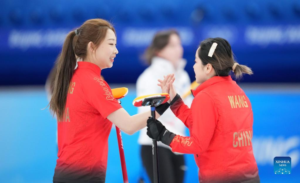 Zhang Lijun (L) and Wang Rui of China compete during the curling women's round robin session 7 of Beijing Winter Olympics between China and Japan at National Aquatics Centre in Beijing, capital of China, Feb. 14, 2022. (Xinhua/Zhou Mi)