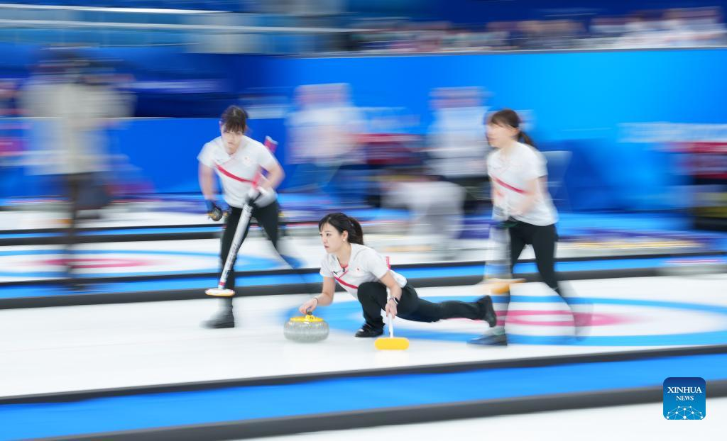 Yoshida Chinami (C) of Japan competes during the curling women's round robin session 7 of Beijing Winter Olympics between China and Japan at National Aquatics Centre in Beijing, capital of China, Feb. 14, 2022. (Xinhua/Zhou Mi)