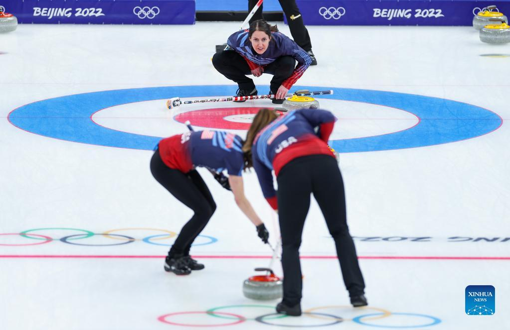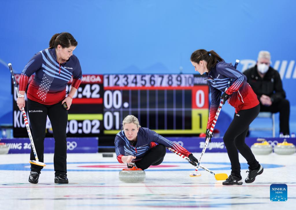 (L to R) Becca Hamilton, Nina Roth and Tara Peterson of the United States compete during the curling women's round robin session 7 of Beijing Winter Olympics between the United States and South Korea at National Aquatics Centre in Beijing, capital of China, Feb. 14, 2022. (Xinhua/Wang Jingqiang)