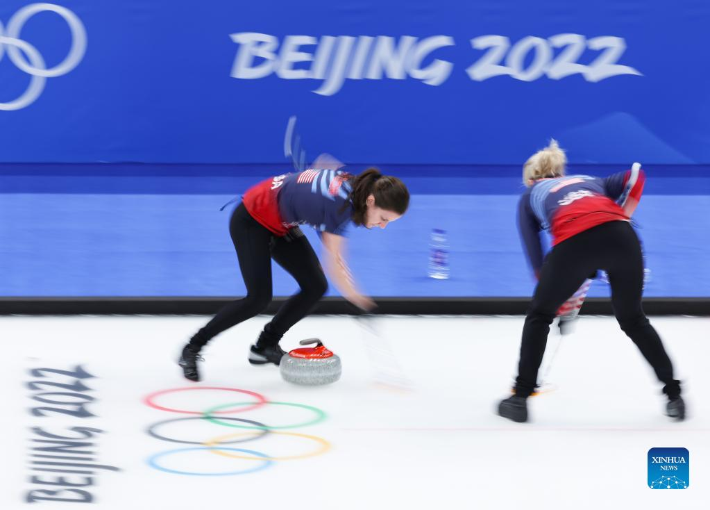 Tara Peterson (L) and Nina Roth of the United States compete during the curling women's round robin session 7 of Beijing Winter Olympics between the United States and South Korea at National Aquatics Centre in Beijing, capital of China, Feb. 14, 2022. (Xinhua/Wang Jingqiang)