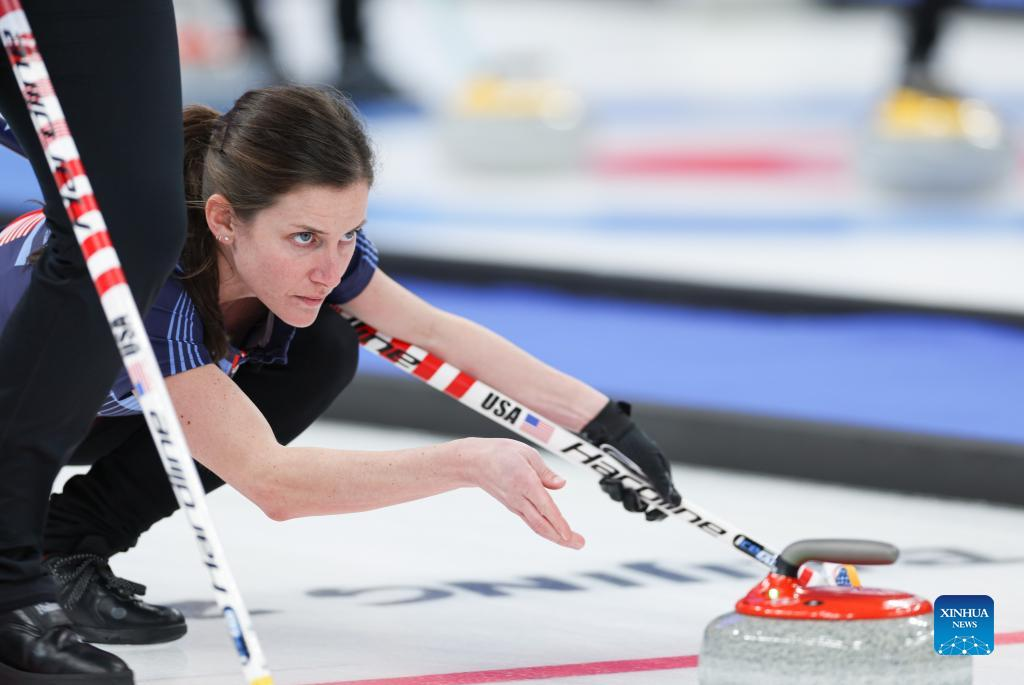 Tara Peterson of the United States competes during the curling women's round robin session 7 of Beijing Winter Olympics between the United States and South Korea at National Aquatics Centre in Beijing, capital of China, Feb. 14, 2022. (Xinhua/Wang Jingqiang)