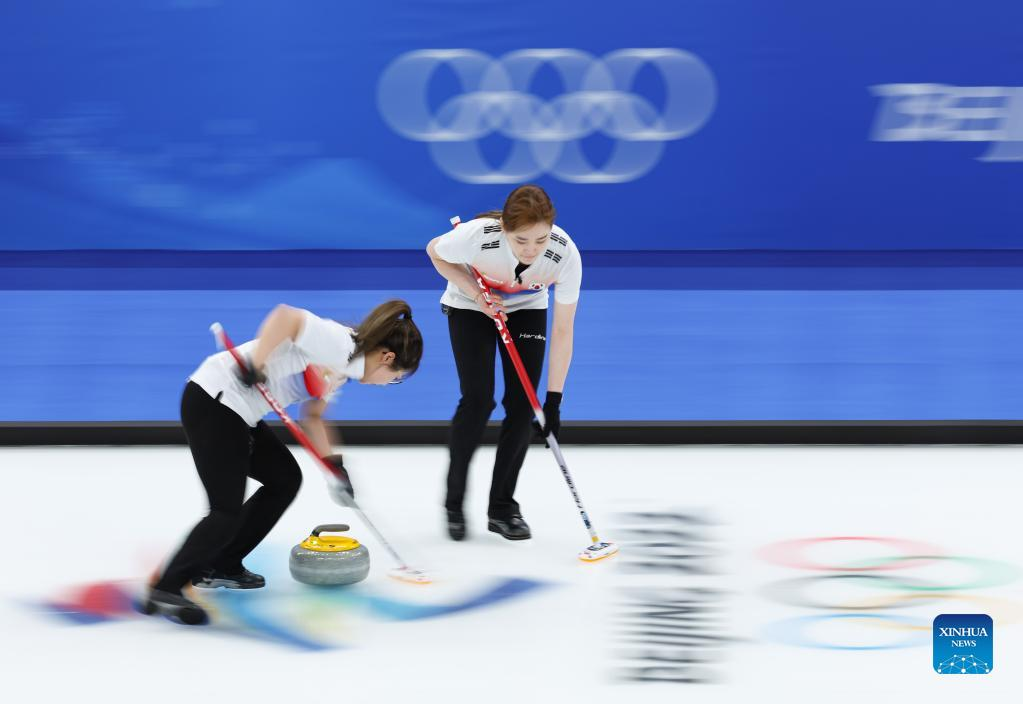 Kim Chohi (R) and Kim Seonyeong of South Korea compete during the curling women's round robin session 7 of Beijing Winter Olympics between the United States and South Korea at National Aquatics Centre in Beijing, capital of China, Feb. 14, 2022. (Xinhua/Wang Jingqiang)