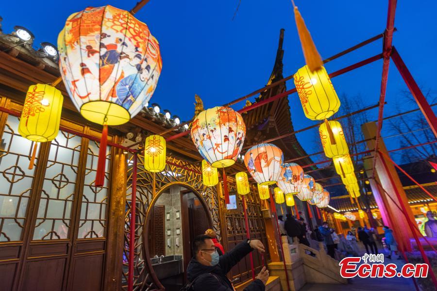 People view lanterns ahead of the Lantern Festival at Nanjing Confucius Temple (Fuzimiao) in east China's Jiangsu Province, Feb. 13, 2022. The Lantern Festival, celebrated on the 15th day of the first month of the Chinese lunar calendar, falls on Tuesday this year. It features family reunions, feasts and various cultural activities. (Photo: China News Service/Yang Bo)