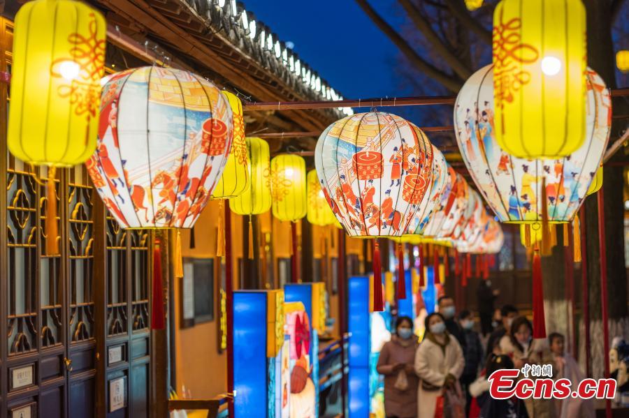 People view lanterns ahead of the Lantern Festival at Nanjing Confucius Temple (Fuzimiao) in east China's Jiangsu Province, Feb. 13, 2022. The Lantern Festival, celebrated on the 15th day of the first month of the Chinese lunar calendar, falls on Tuesday this year. It features family reunions, feasts and various cultural activities. (Photo: China News Service/Yang Bo)