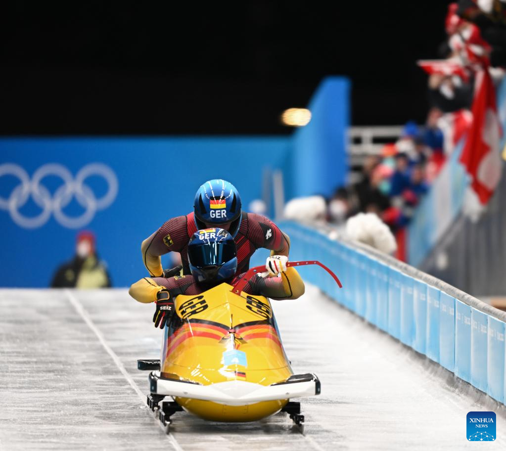 Francesco Friedrich/Thorsten Margis of Germany compete during the bobsleigh 2-man heat of Beijing 2022 Winter Olympics at National Sliding Centre in Yanqing District, Beijing, capital of China, Feb. 14, 2022. (Xinhua/Sun Fei)