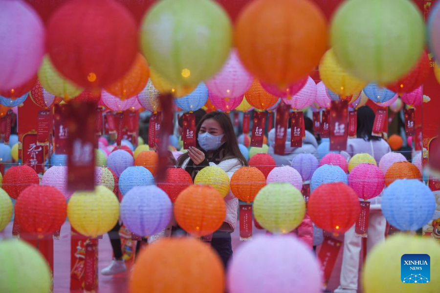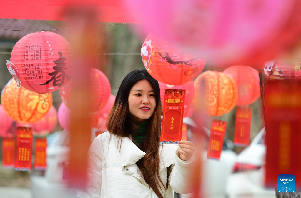 Residents take part in a riddle guessing activity to celebrate the upcoming Lantern Festival in Xingtai, north China's Hebei Province, Feb. 14, 2022. The Lantern Festival, the 15th day of the first month of the Chinese lunar calendar, falls on Feb. 15 this year. (Photo by Zhang Chi/Xinhua)