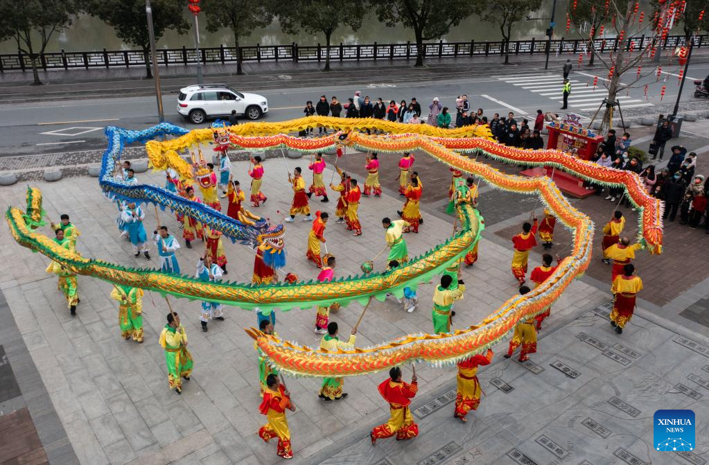 Aerial photo taken on Feb. 14, 2022 shows people watching dragon dance to celebrate the upcoming Lantern Festival in the ancient town of Shouchang in Jiande, east China's Zhejiang Province. (Xinhua/Xu Yu)