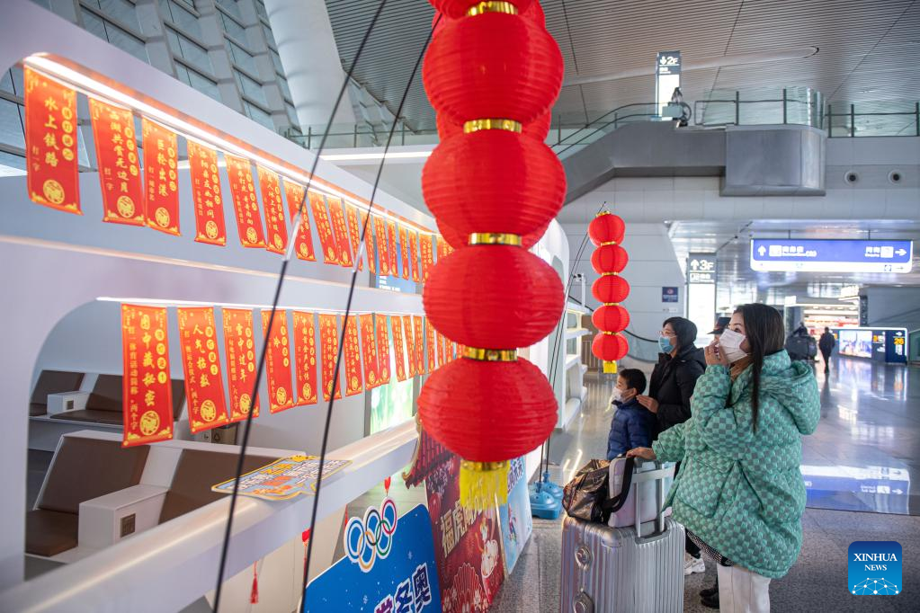 Passengers take part in a riddle guessing activity at the waiting hall of Hangzhou East Railway station to celebrate the upcoming Lantern Festival in Hangzhou, east China's Zhejiang Province, Feb. 14, 2022. The Lantern Festival, the 15th day of the first month of the Chinese lunar calendar, falls on Feb. 15 this year. (Xinhua/Jiang Han)