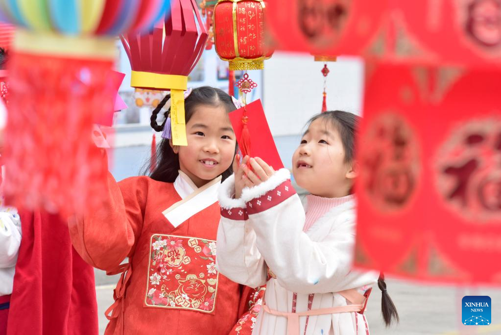 Children in traditional clothing take part in a riddle guessing activity to celebrate the upcoming Lantern Festival in Hefei, east China's Anhui Province, Feb. 14, 2022. The Lantern Festival, the 15th day of the first month of the Chinese lunar calendar, falls on Feb. 15 this year. (Photo by Ge Yinian/Xinhua)
