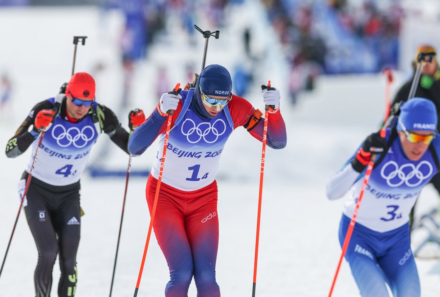 Vetle Sjaastad Christiansen (C) of Norway competes during biathlon men's 4x7.5km relay at National Biathlon Center in Zhangjiakou, north China's Hebei Province, Feb. 15, 2022. (Xinhua/Ding Ting)
