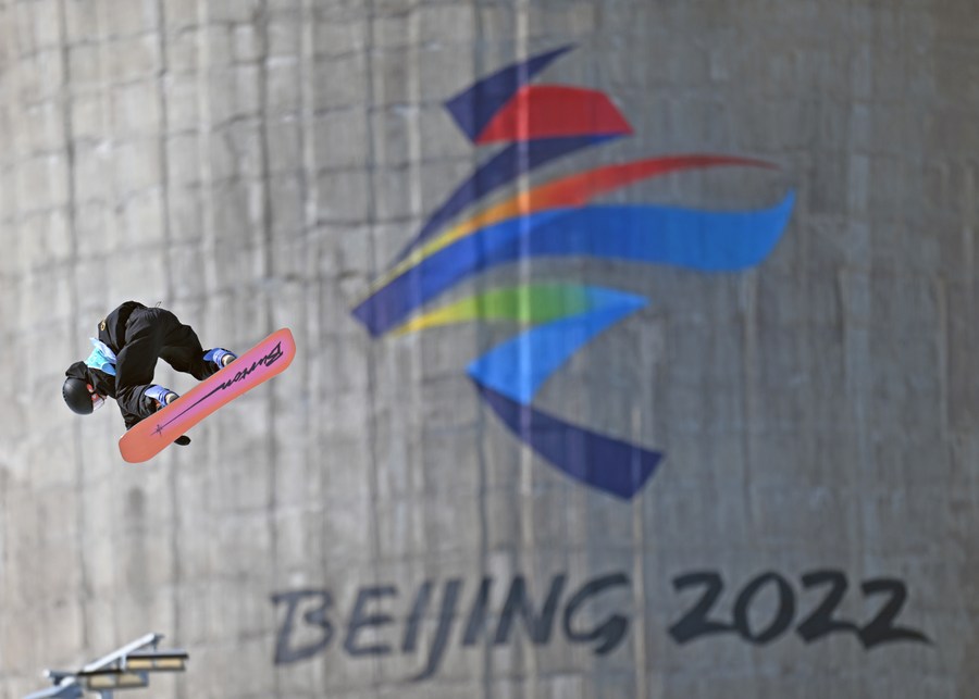 Su Yiming of China competes during the men's snowboard big air final of Beijing 2022 Winter Olympics at Big Air Shougang in Beijing, Feb. 15, 2022. (Xinhua/Li Ga)