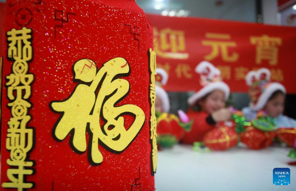 Children make lanterns to celebrate the Lantern Festival in Yangzhou City, east China's Jiangsu Province, Feb. 14, 2022. The Lantern Festival, the 15th day of the first month of the Chinese lunar calendar, falls on Feb. 15 this year. (Photo by Meng Delong/Xinhua)