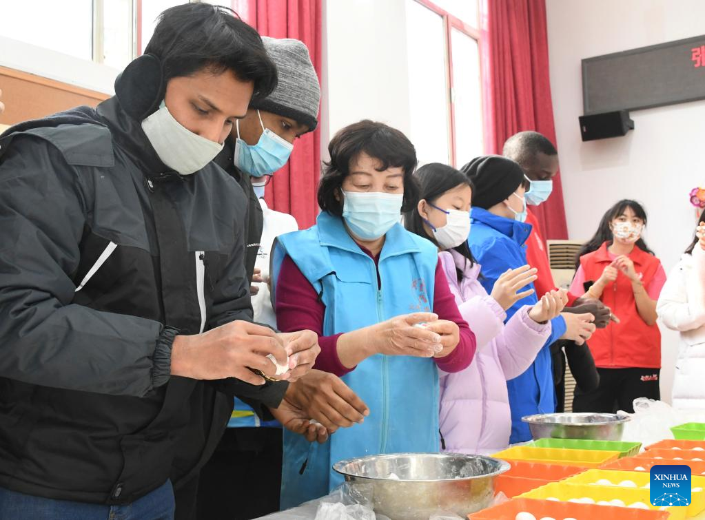 Overseas students make glutinous rice balls with community volunteers to celebrate the Lantern Festival, in Beijing, capital of China, Feb. 15, 2022. The Lantern Festival, the 15th day of the first month of the Chinese lunar calendar, falls on Feb. 15 this year. (Xinhua/Ren Chao)