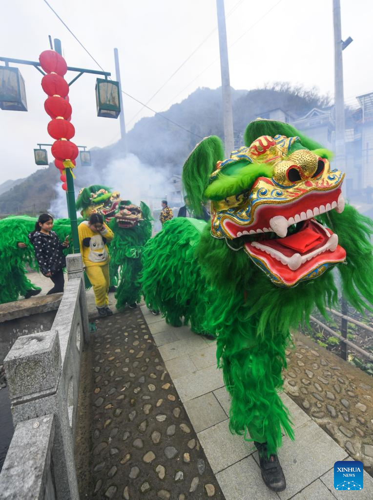 People perform lion dance to celebrate the Lantern Festival in Weiyuan County of Dingxi, northwest China's Gansu Province, Feb. 15, 2022. The Lantern Festival, the 15th day of the first month of the Chinese lunar calendar, falls on Feb. 15 this year. (Xinhua/Ma Xiping)