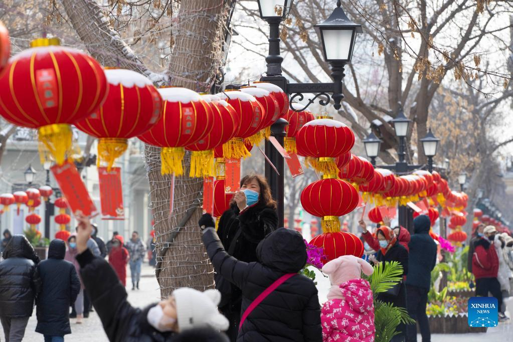 Pedestrians take part in a riddle guessing activity to celebrate the Lantern Festival at the Central Street in Harbin, northeast China's Heilongjiang Province, Feb. 15, 2022. The Lantern Festival, the 15th day of the first month of the Chinese lunar calendar, falls on Feb. 15 this year. (Xinhua/Zhang Tao)