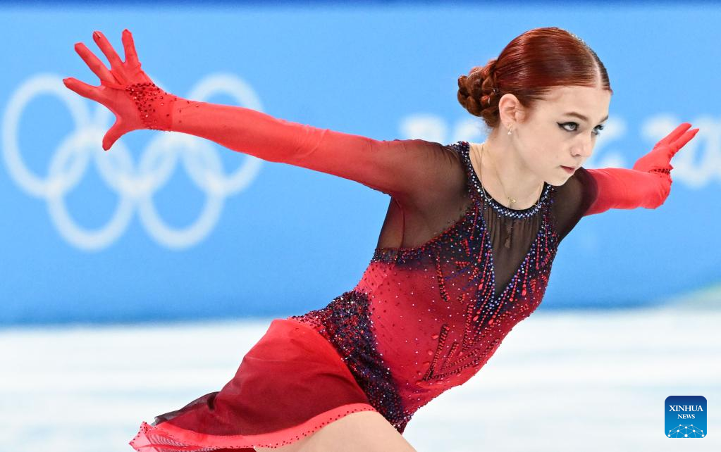 Alexandra Trusova of ROC performs during the figure skating women single skating short program at Capital Indoor Stadium in Beijing, capital of China, Feb. 15, 2022. (Xinhua/Chen Jianli)