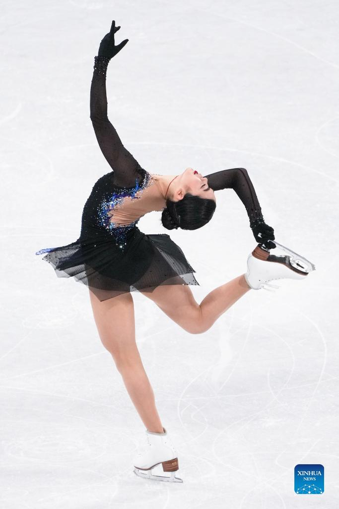 Anna Shcherbakova of ROC performs during the figure skating women single skating short program at Capital Indoor Stadium in Beijing, capital of China, Feb. 15, 2022. (Xinhua/Ma Ning)