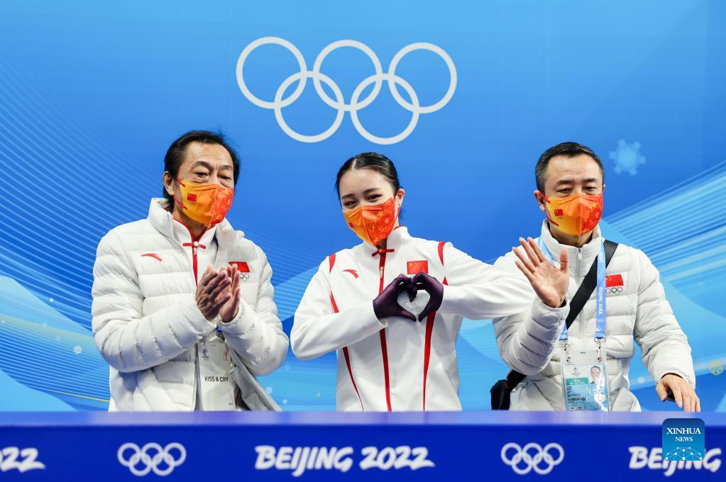 Zhu Yi (C) of China waits for her score during the figure skating women single skating short program at Capital Indoor Stadium in Beijing, capital of China, Feb. 15, 2022. (Xinhua/Cao Can)