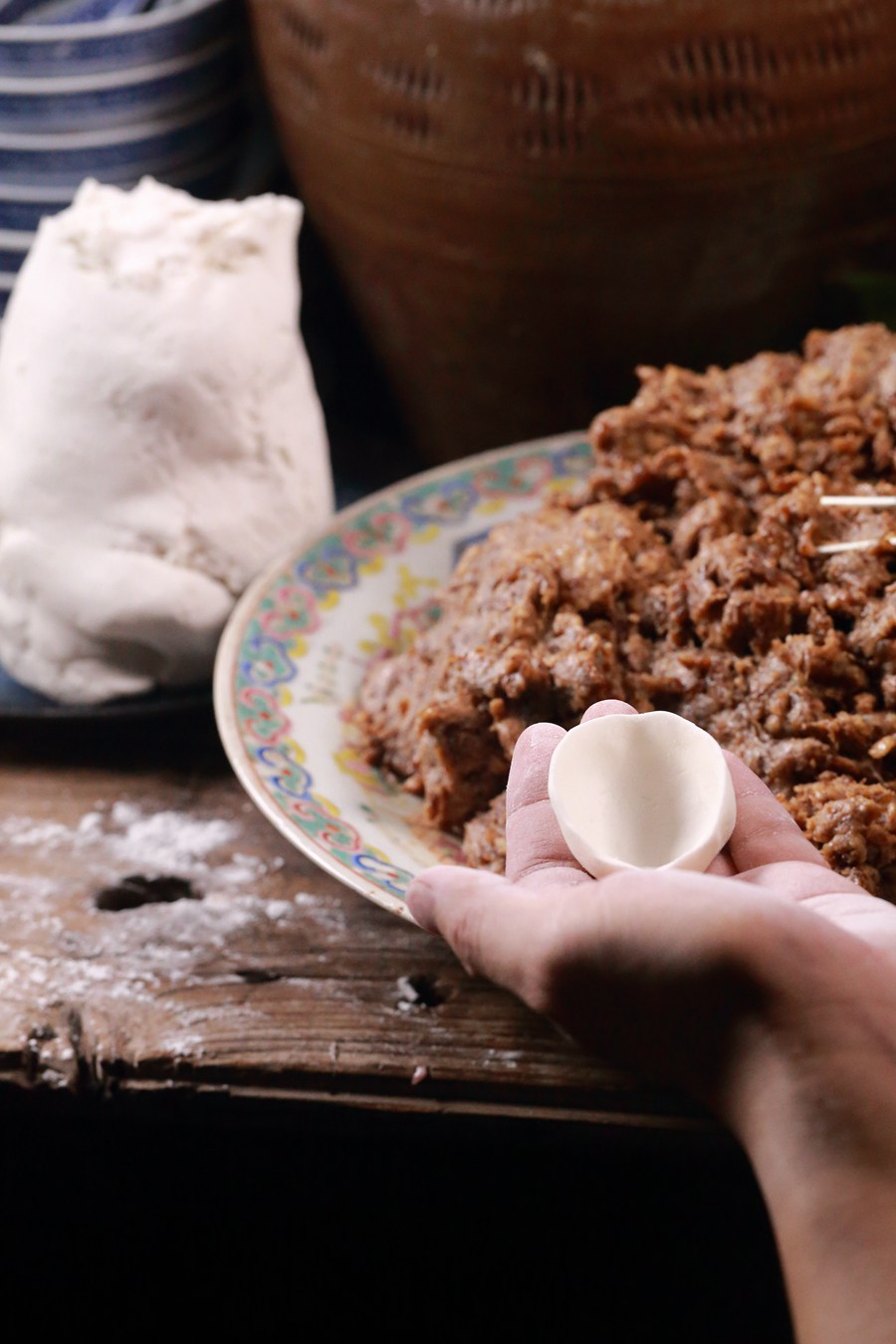 Lin Yingde makes meat stuffing for his restaurant’s special glutinous rice balls. (Photo/Lin Wei)