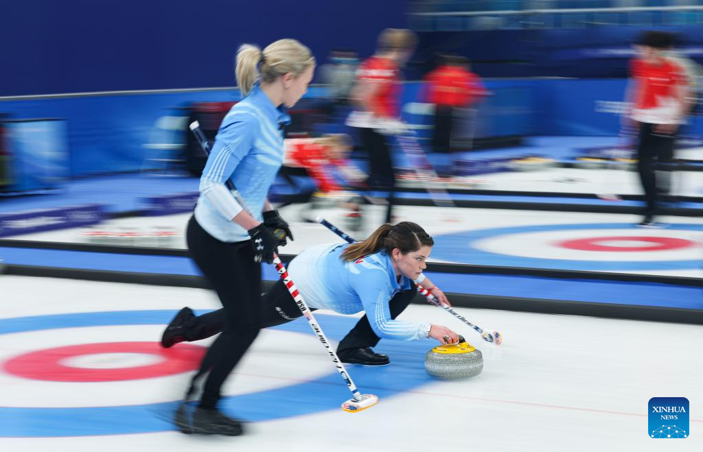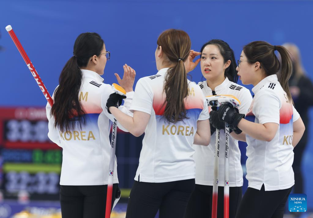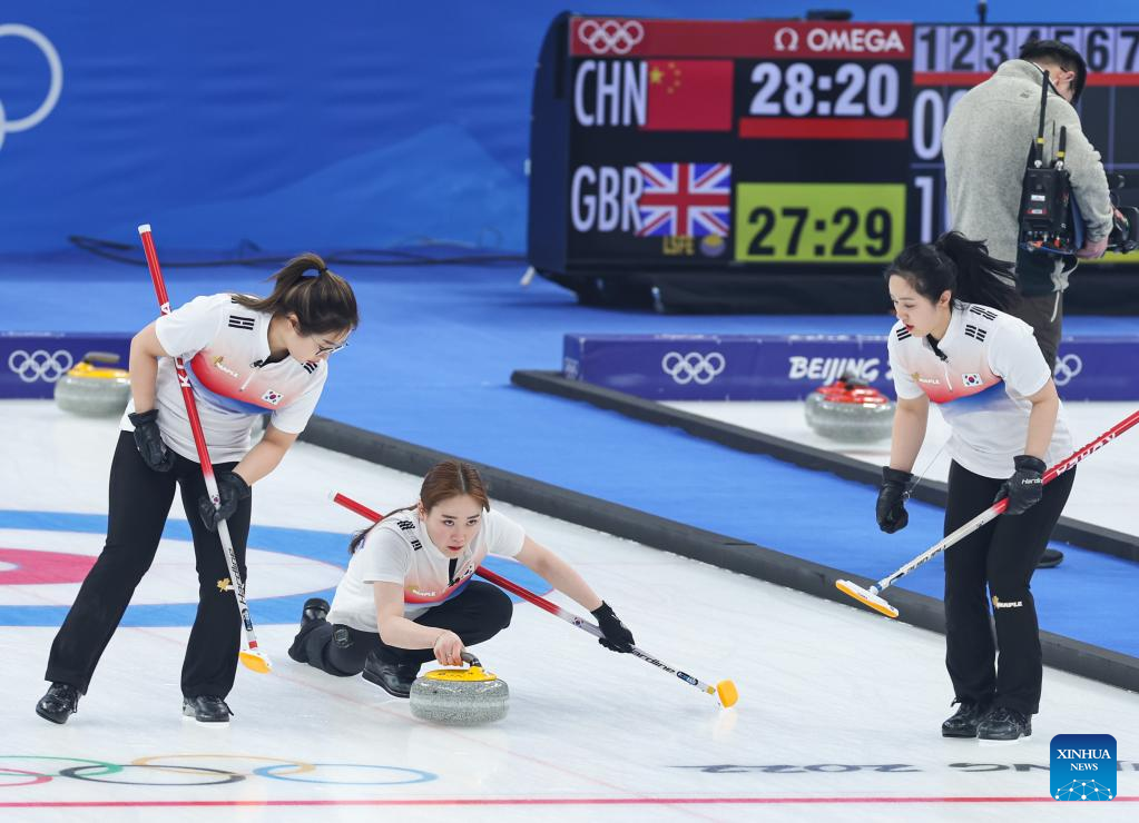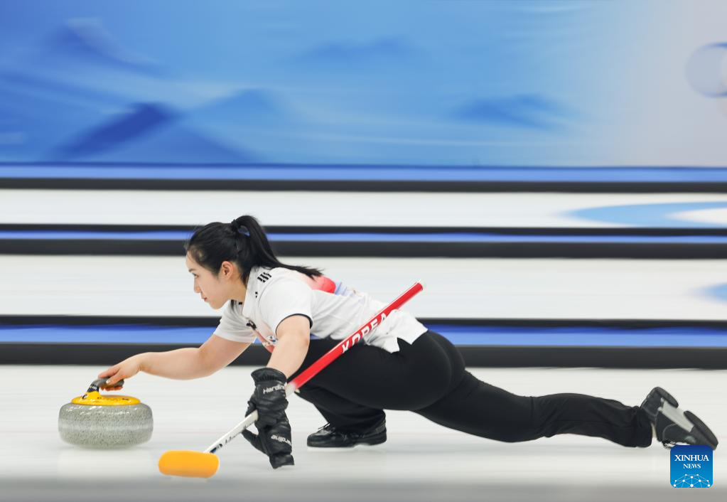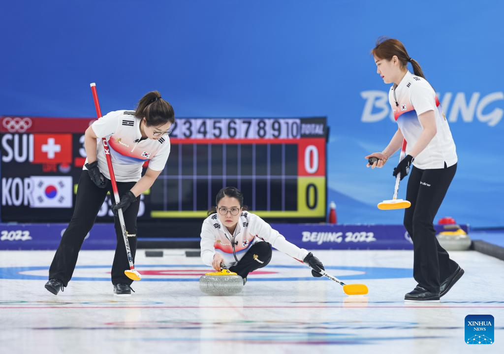 Athletes of South Korea compete during the curling women's round robin session 10 of Beijing Winter Olympics between Switzerland and South Korea at National Aquatics Centre in Beijing, capital of China, Feb. 16, 2022. (Xinhua/Wang Jingqiang)