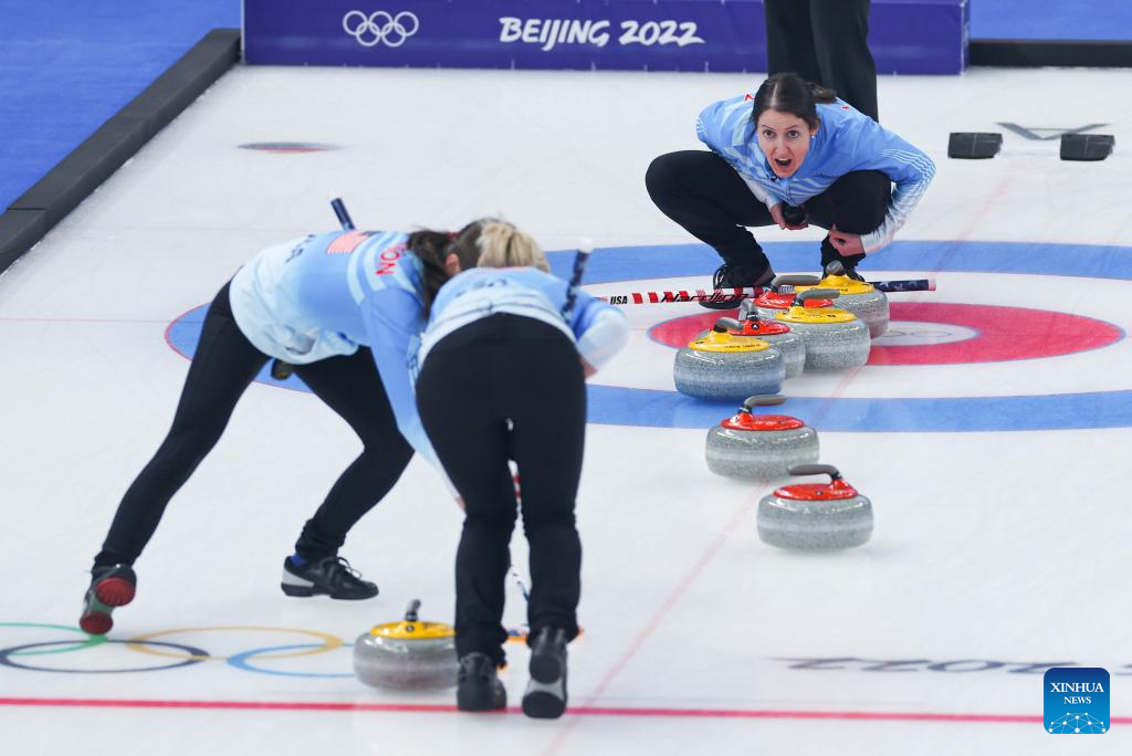 (R to L) Nina Roth, Tara Peterson and Becca Hamilton of the United States compete during the curling women's round robin session 10 of Beijing 2022 Winter Olympics between the United States and Canada at National Aquatics in Beijing, capital of China, Feb. 16, 2022. (Xinhua/Wang Jingqiang)