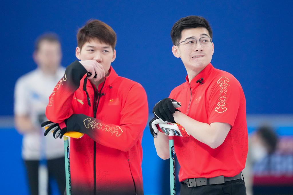 Wang Zhiyu (L) and Xu Jingtao of China react the curling men's round robin session 11 of Beijing 2022 Winter Olympics between China and Switzerland at National Aquatics Centre in Beijing, capital of China, Feb. 16, 2022. (Xinhua/Zhou Mi)