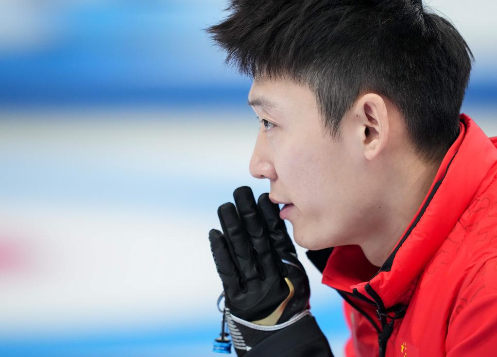 Xu Jingtao of China competes during the curling men's round robin session 11 of Beijing 2022 Winter Olympics between China and Switzerland at National Aquatics Centre in Beijing, capital of China, Feb. 16, 2022. (Xinhua/Zhou Mi)