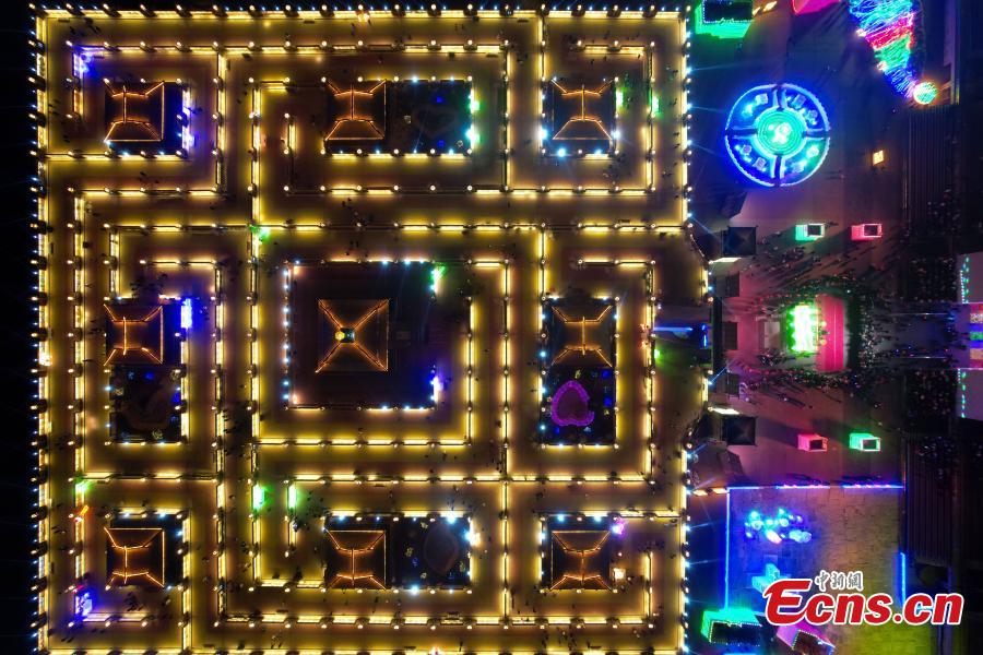 Aerial photo shows the dazzling Jiuqu Yellow River Lights Array in Zhangye city, northwest China's Gansu Province, Feb. 15, 2022. (Photo: China News Service/Cheng Xuelei)