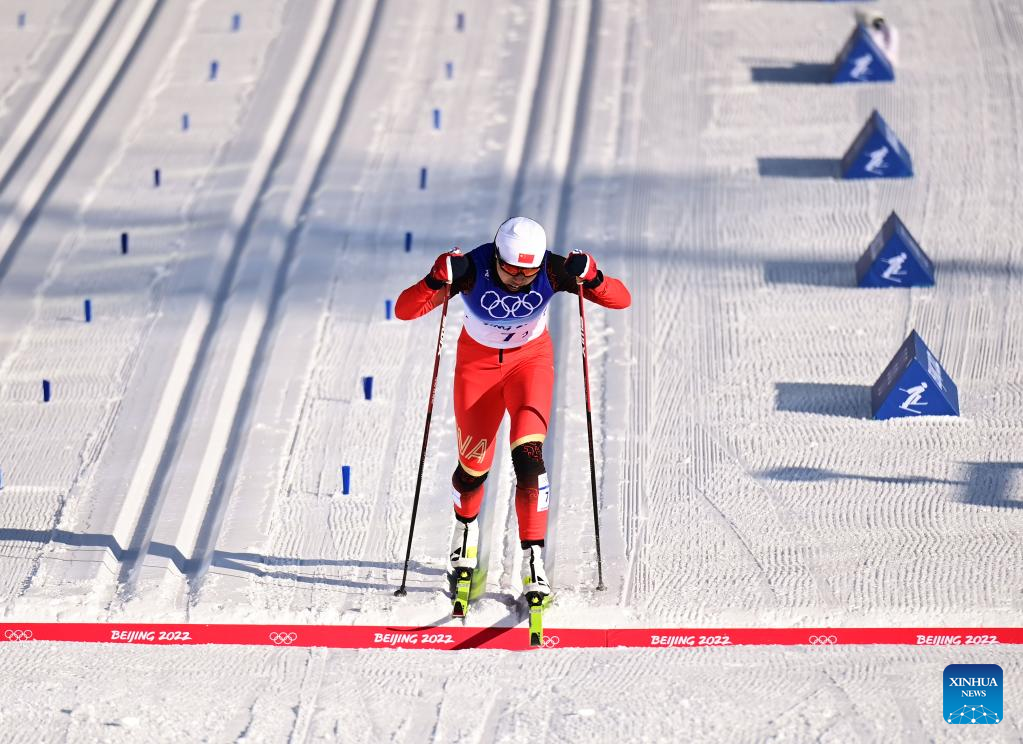Li Xin of China crosses the finish line during the cross-country skiing women's team sprint classic semifinals of the Beijing Winter Olympics at National Cross-Country Skiing Centre in Zhangjiakou, north China's Hebei Province, Feb. 16, 2022. (Xinhua/Zhang Hongxiang)
