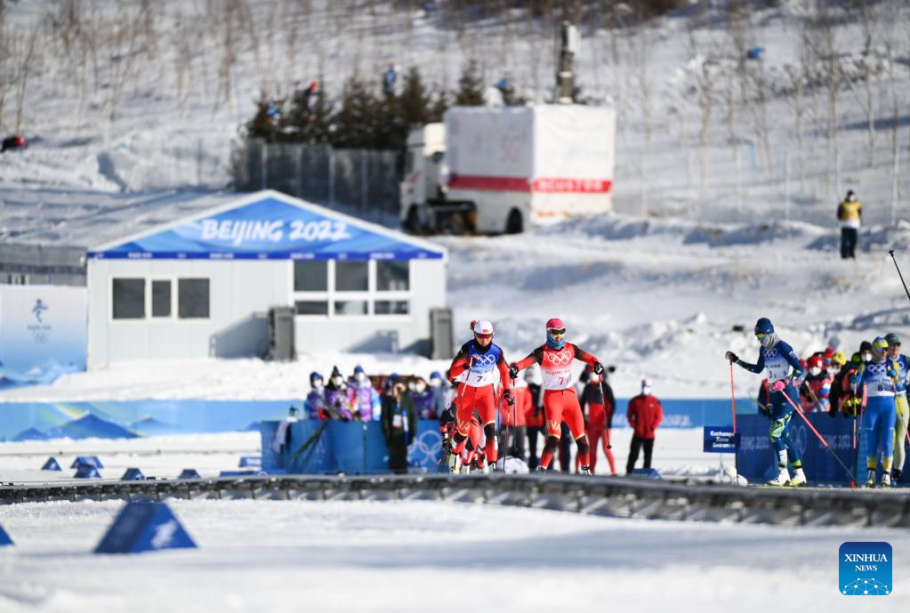 Chi Chunxue (1st R) of China competes during the cross-country skiing women's team sprint classic semifinals of the Beijing Winter Olympics at National Cross-Country Skiing Centre in Zhangjiakou, north China's Hebei Province, Feb. 16, 2022. (Xinhua/Zhang Hongxiang)