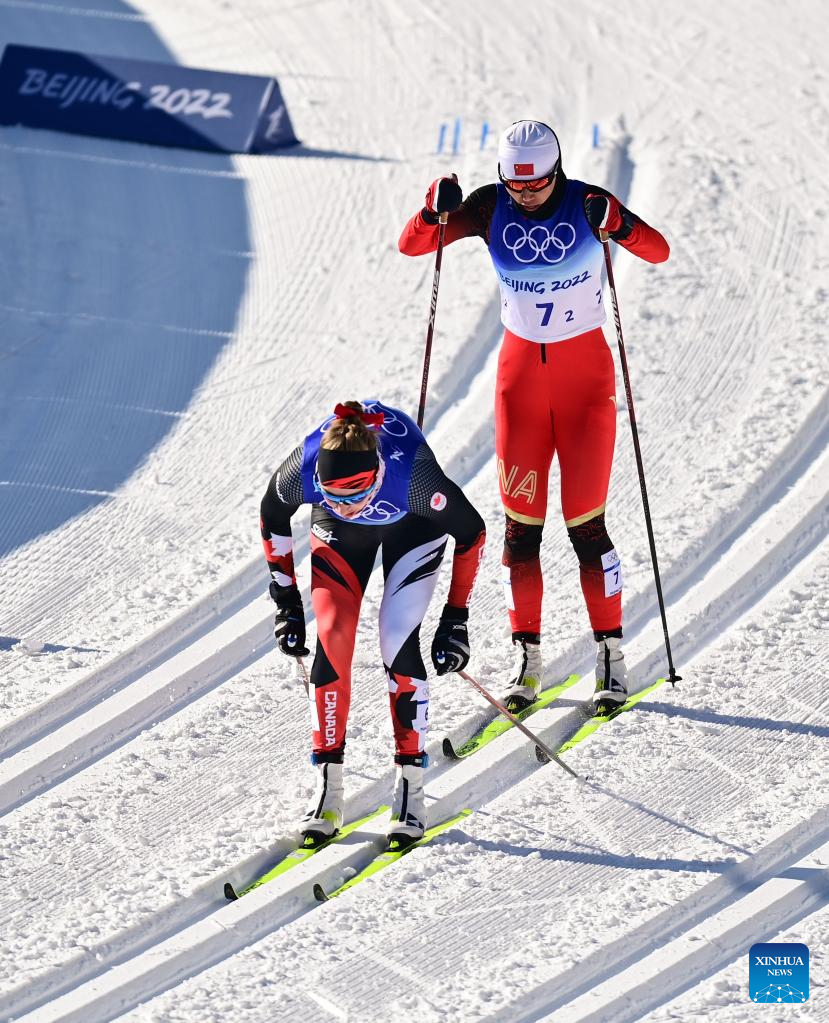 Li Xin (R) of China competes during the cross-country skiing women's team sprint classic semifinals of the Beijing Winter Olympics at National Cross-Country Skiing Centre in Zhangjiakou, north China's Hebei Province, Feb. 16, 2022. (Xinhua/Zhang Hongxiang)