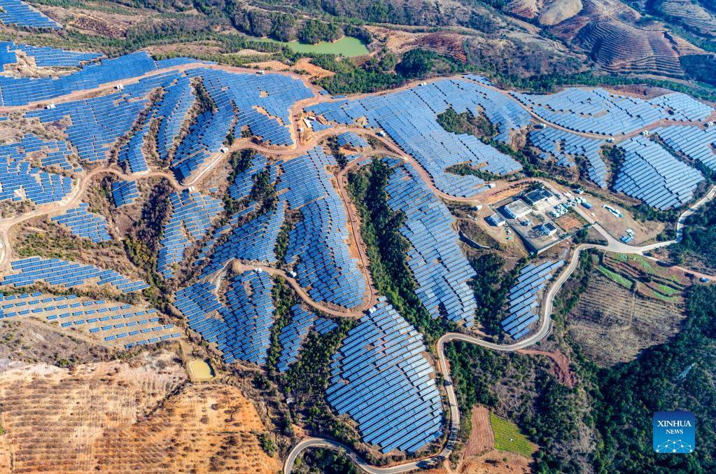 Aerial photo taken on Feb. 16, 2022 shows a photovoltaic power station in Yongren County of Chuxiong Yi Autonomous Prefecture, southwest China's Yunnan Province. Taking advantage of its rich solar power resources, Yongren County has invited companies to build photovoltaic power stations, helping create jobs and boost income for local villagers. Right now, over 112 photovoltaic stations have been built countywide, achieving a total output value of 1.6 billion yuan (about 252,640,000 U.S. dollars). (Xinhua/Chen Xinbo)