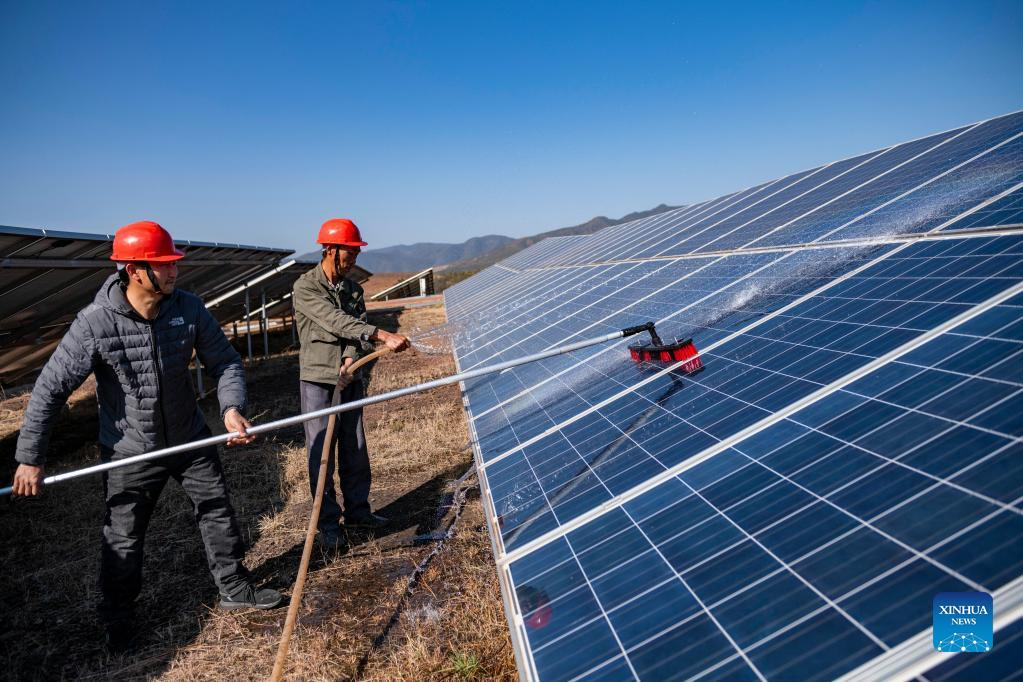 Villagers clean photovoltaic solar panels at a photovoltaic power station in Yongren County of Chuxiong Yi Autonomous Prefecture, southwest China's Yunnan Province, Feb. 16, 2022. Taking advantage of its rich solar power resources, Yongren County has invited companies to build photovoltaic power stations, helping create jobs and boost income for local villagers. Right now, over 112 photovoltaic stations have been built countywide, achieving a total output value of 1.6 billion yuan (about 252,640,000 U.S. dollars). (Xinhua/Chen Xinbo)