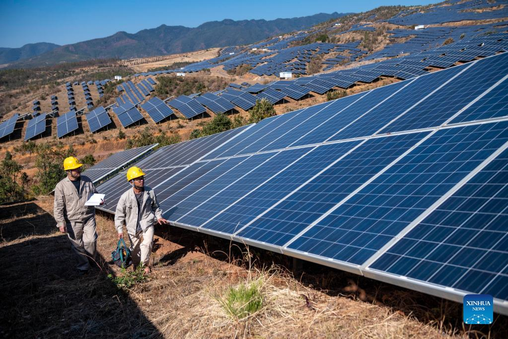 Staff members inspect solar panels at a photovoltaic power station in Yongren County of Chuxiong Yi Autonomous Prefecture, southwest China's Yunnan Province, Feb. 16, 2022. Taking advantage of its rich solar power resources, Yongren County has invited companies to build photovoltaic power stations, helping create jobs and boost income for local villagers. Right now, over 112 photovoltaic stations have been built countywide, achieving a total output value of 1.6 billion yuan (about 252,640,000 U.S. dollars). (Xinhua/Chen Xinbo)
