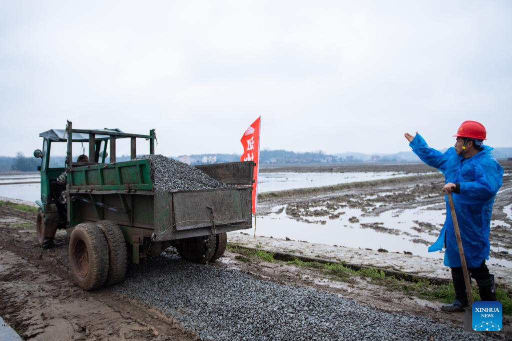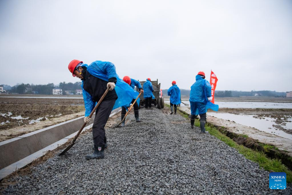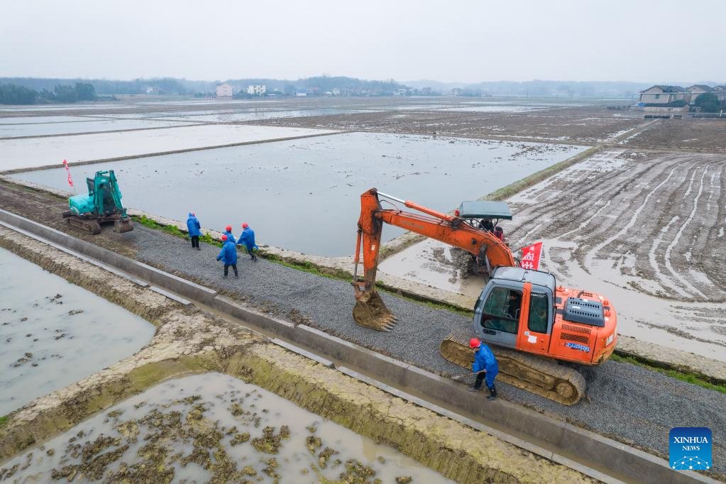Staff members work at the construction site of high-standard farmland in Daping Village of Taoyuan County, central China's Hunan Province, Feb. 17, 2022. Taoyuan County, a major grain producer in Hunan Province, is stepping up high-standard farmland construction with a package of supporting policies including upgrading facilities and irrigation systems ahead of the farming season. The county, with an aim of achieving a total of 122,200 mu (about 8,146 hectares) high-standard farmland, has accomplished 90 percent of its goal since late October in 2021. (Xinhua/Chen Sihan)