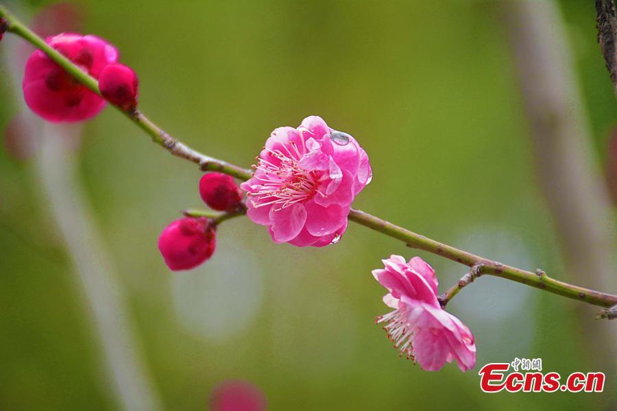 Plum blossoms are seen in full bloom in snow at a park in Anqing, Anhui Province, Feb. 17, 2022. Blossoming plum blossoms were covered by snowflake, forming a magical winter scene. (Photo: China News Service/Wu Junqi)