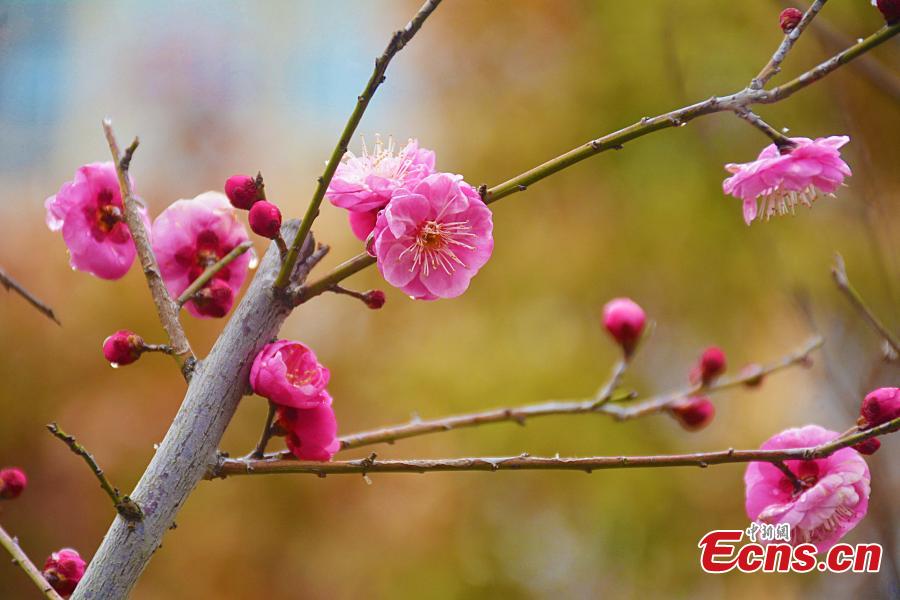 Plum blossoms are seen in full bloom in snow at a park in Anqing, Anhui Province, Feb. 17, 2022. Blossoming plum blossoms were covered by snowflake, forming a magical winter scene. (Photo: China News Service/Wu Junqi)