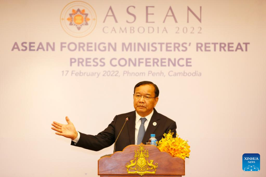 Cambodian Foreign Minister Prak Sokhonn speaks during a press conference in Phnom Penh, Cambodia, Feb. 17, 2022. (Photo by Sovannara/Xinhua)