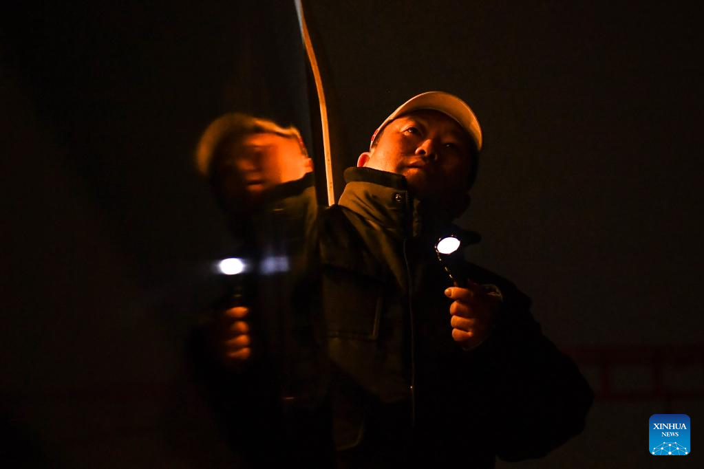 Wu Guohua, head of a maintenance team, inspects the pantograph of a bullet train in Taiyuan, north China's Shanxi Province, Feb. 16, 2022. In spite of the cold weather, a maintenance team under China Railway Taiyuan Group Co., Ltd. inspects over 70 different types of electric multiple unit (EMU) trains on a daily basis to ensure that local bullet trains run smoothly. (Xinhua/Cao Yang)