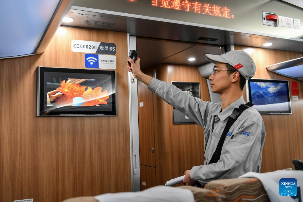 A railway mechanic inspects the power distribution cabinet on a bullet train in Taiyuan, north China's Shanxi Province, Feb. 16, 2022. In spite of the cold weather, a maintenance team under China Railway Taiyuan Group Co., Ltd. inspects over 70 different types of electric multiple unit (EMU) trains on a daily basis to ensure that local bullet trains run smoothly. (Xinhua/Cao Yang)