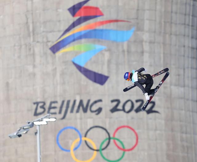 Modeling a fashionable coat with "a golden Chinese dragon" on its back, Chinese athlete Gu Ailing competes in the women's freeski big air final, Feb. 8, 2022. (Xinhua/Lan Hongguang)
