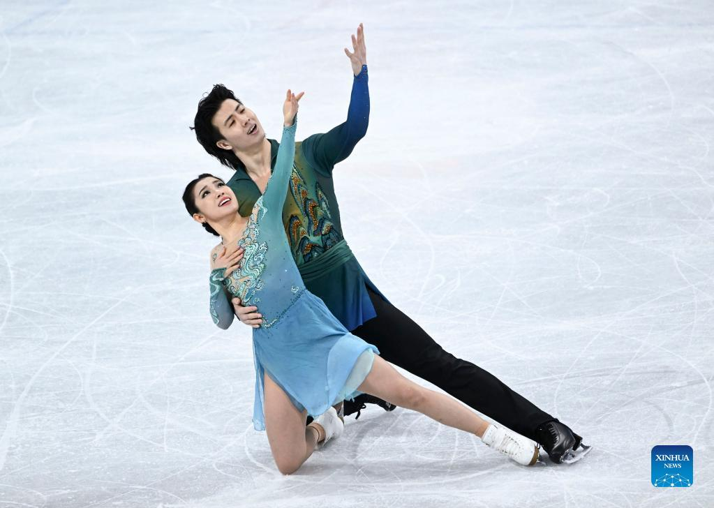 Showing off their green and blue outfits, which resemble the colors of a famous ancient Chinese painting, Wang Shiyue and Liu Xinyu of China perform during the figure skating ice dance free dance event at the Capital Indoor Stadium in Beijing, Feb. 14, 2022. (Xinhua/Wang Jianwei)