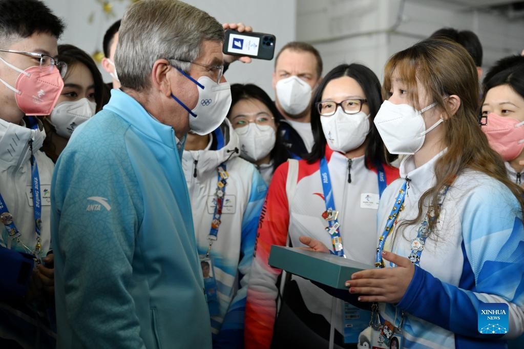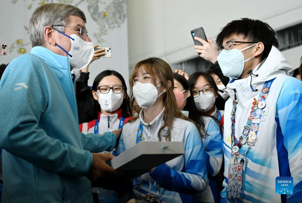 The International Olympic Committee President Thomas Bach interacts with the volunteers of the Beijing 2022 Olympic Winter Games at the Main Media Center for the Games in Beijing, capital of China, Feb. 18, 2022. (Xinhua/Li Yibo)